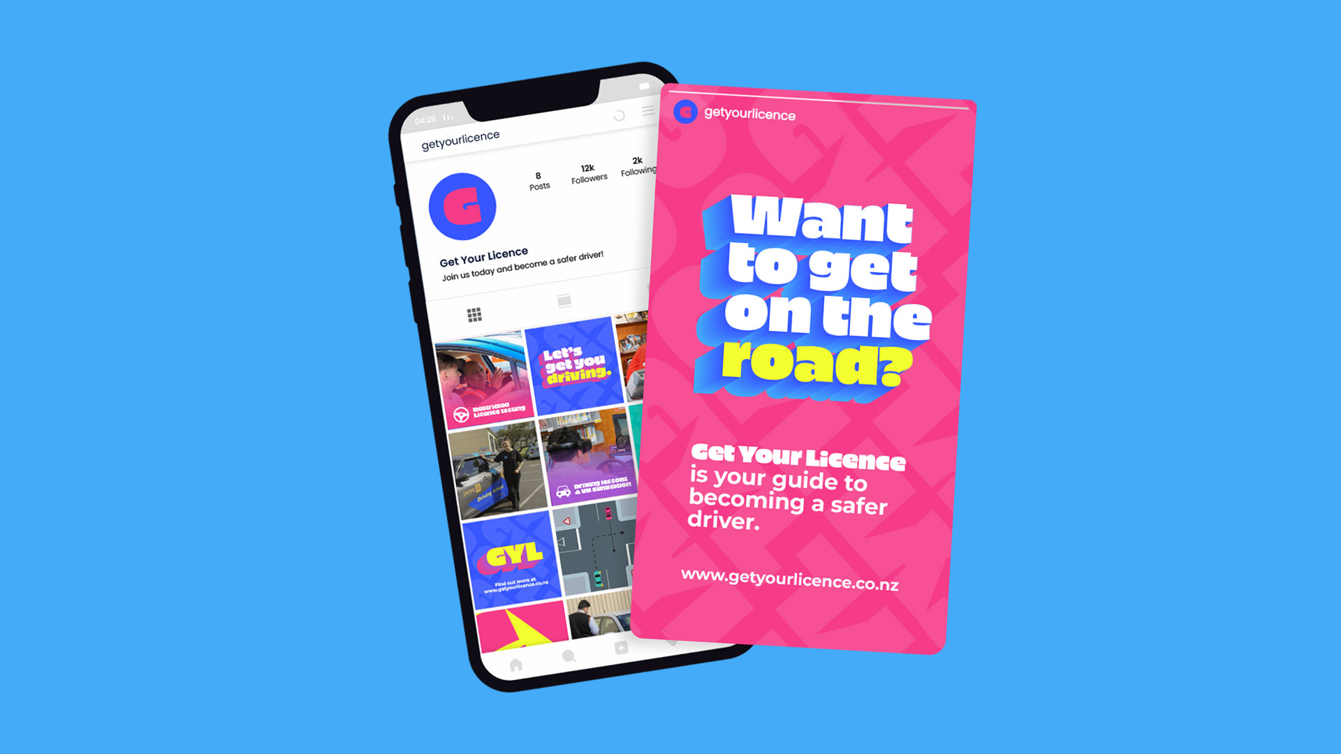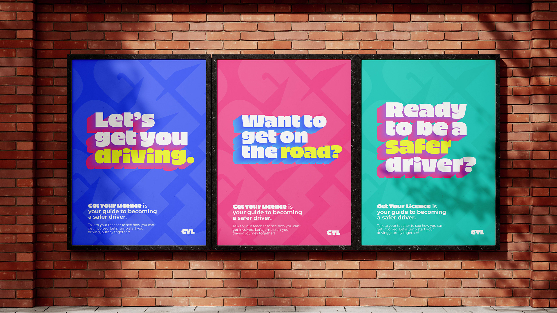 Get Your Licence is a fun, exciting new product designed to help young Kiwi's get driving. The brand identity is designed to be bold and colourful, with the GYL letters used for patterning and iconography.